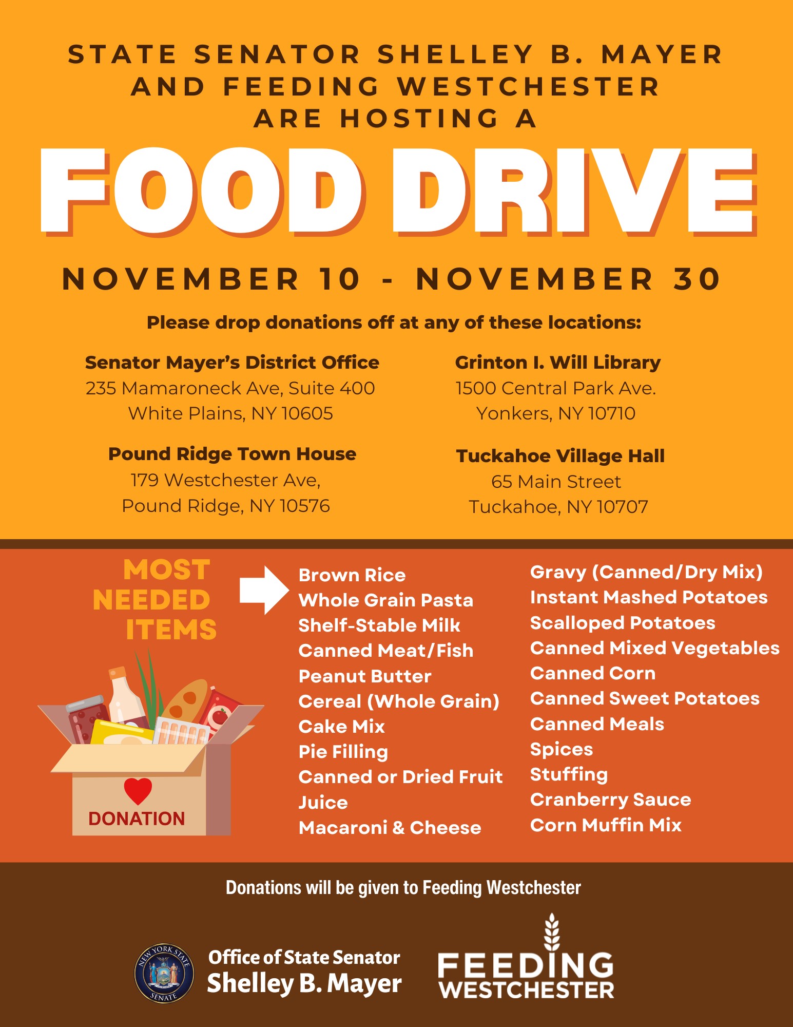 The Town of Pound Ridge is proud to support State Senator Shelley Mayer and Feeding Westchester in their annual Food Drive, taking place from November 10 through November 30. Residents are encouraged to drop off nonperishable food donations at the Town House, located at 179 Westchester Avenue. Items such as brown rice, canned goods, peanut butter, pasta, and shelf-stable milk are especially needed. A full list can be found in the attachment below. All donations will go directly to Feeding Westchester to help families in need throughout our community this holiday season. Thank you for your suppport!